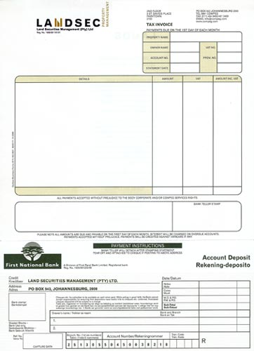 - Payments to us can be made by bank debit order, posted, handed in our offices or paid directly to us at any branch of the First National Bank Credit transfer included in the statement (example).